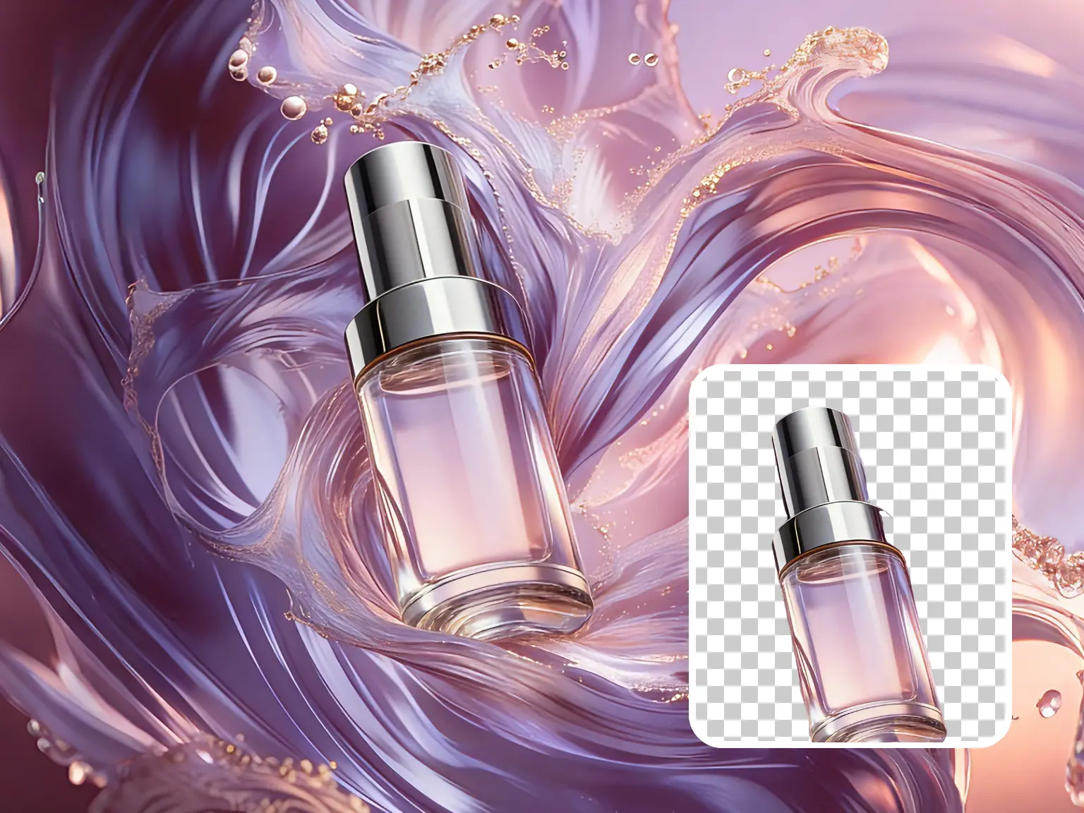 告别 PS 通道抠图,透明液体自动抠取,轮廓背景干净剥离,轻松适配美妆精华液、饮品类产品的创意物料制作。